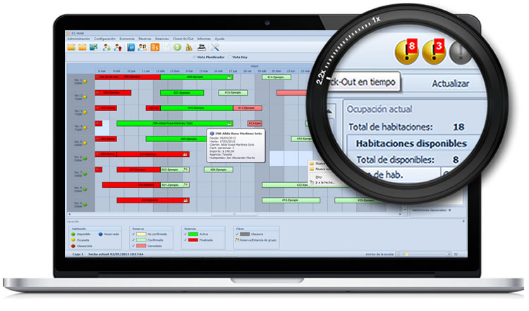 JCL Hotel proporciona una herramienta que consiste en una línea de tiempo interactiva como instrumento de planificación (programador), donde se pueden realizar tantas acciones como desee, como moverse en el tiempo hacia atrás y hacia adelante, filtra los tipos de elementos, check in a las reservas o check out a las estancias. Las principales características son: